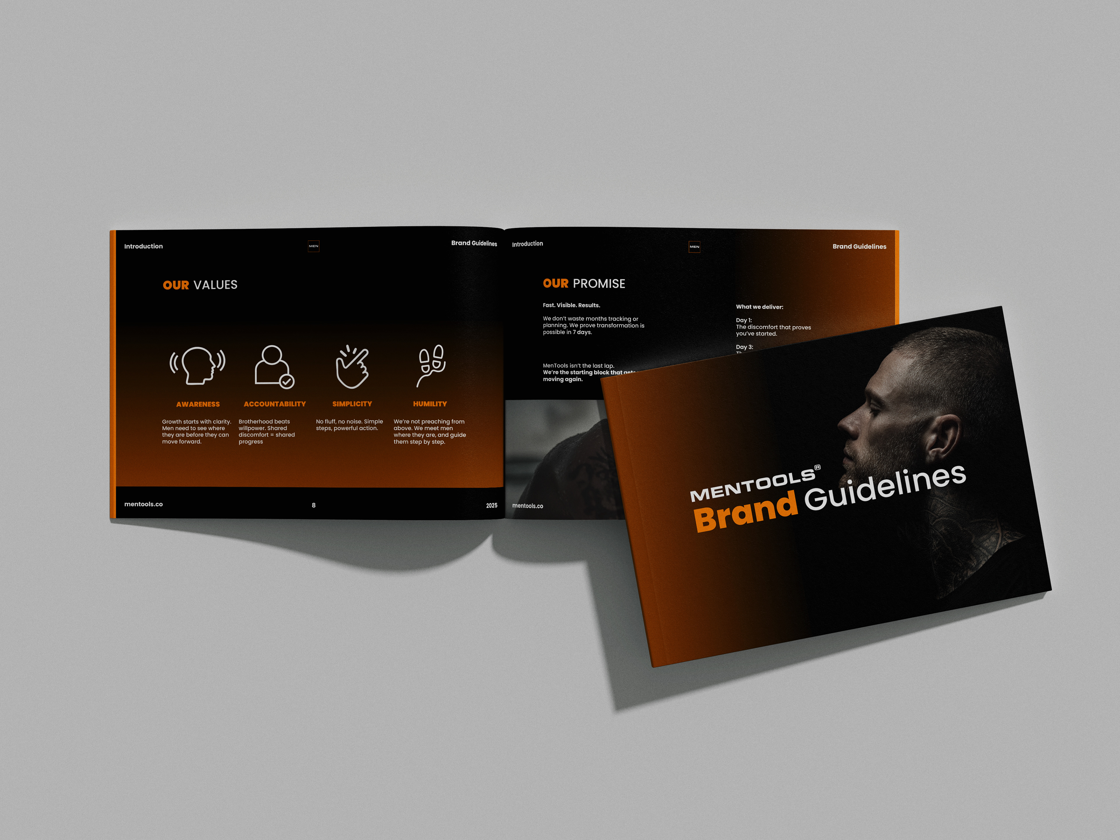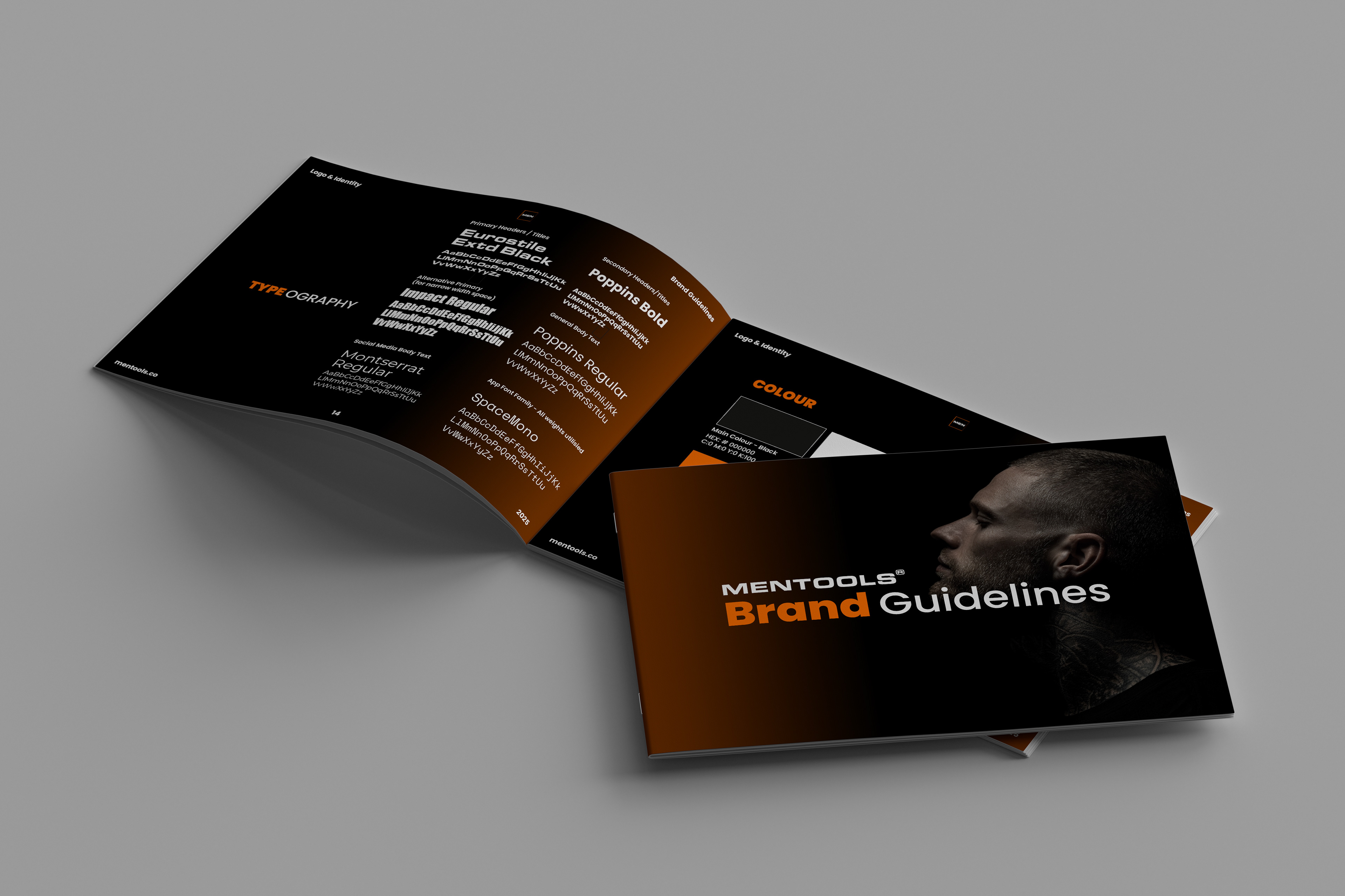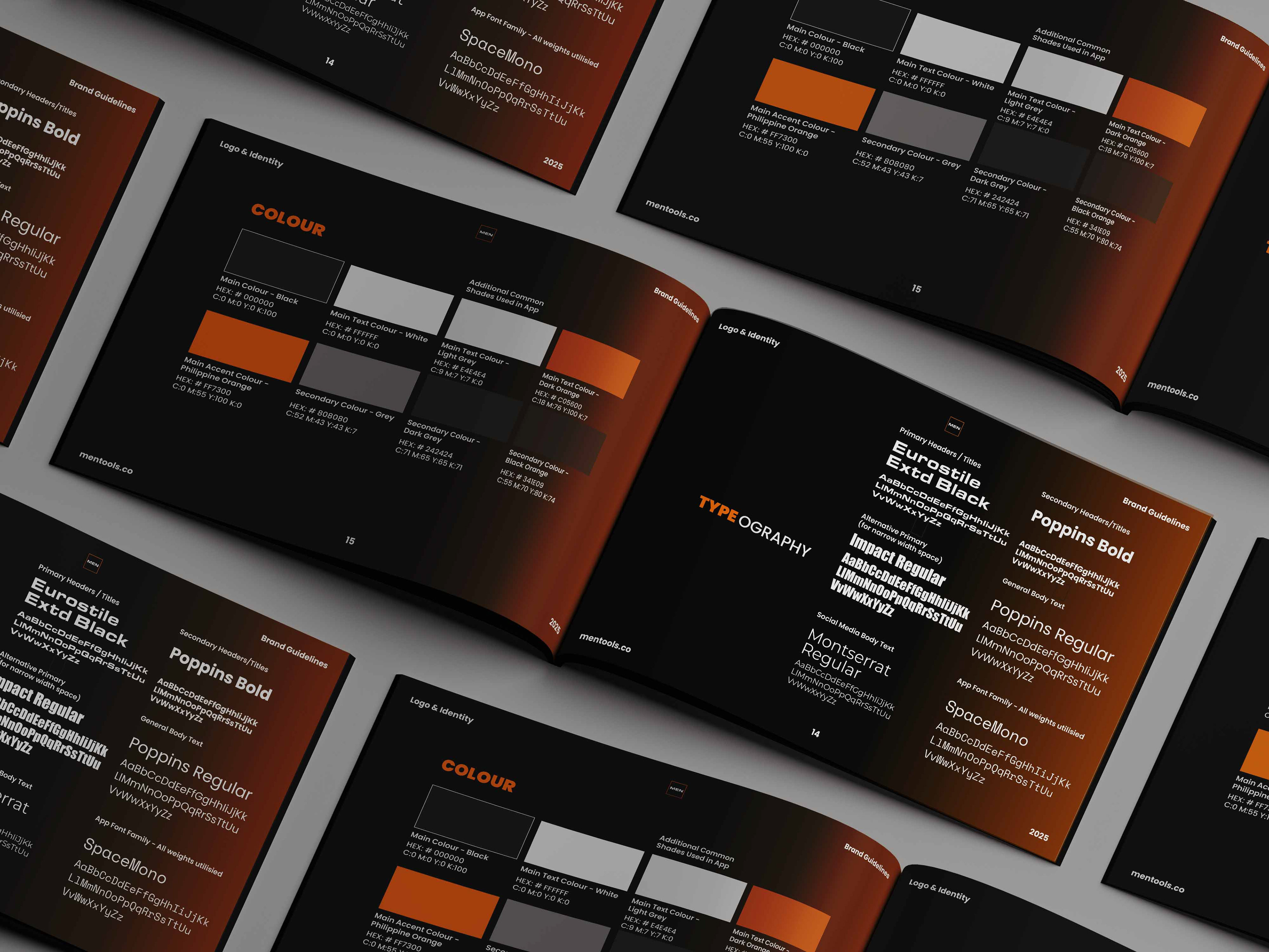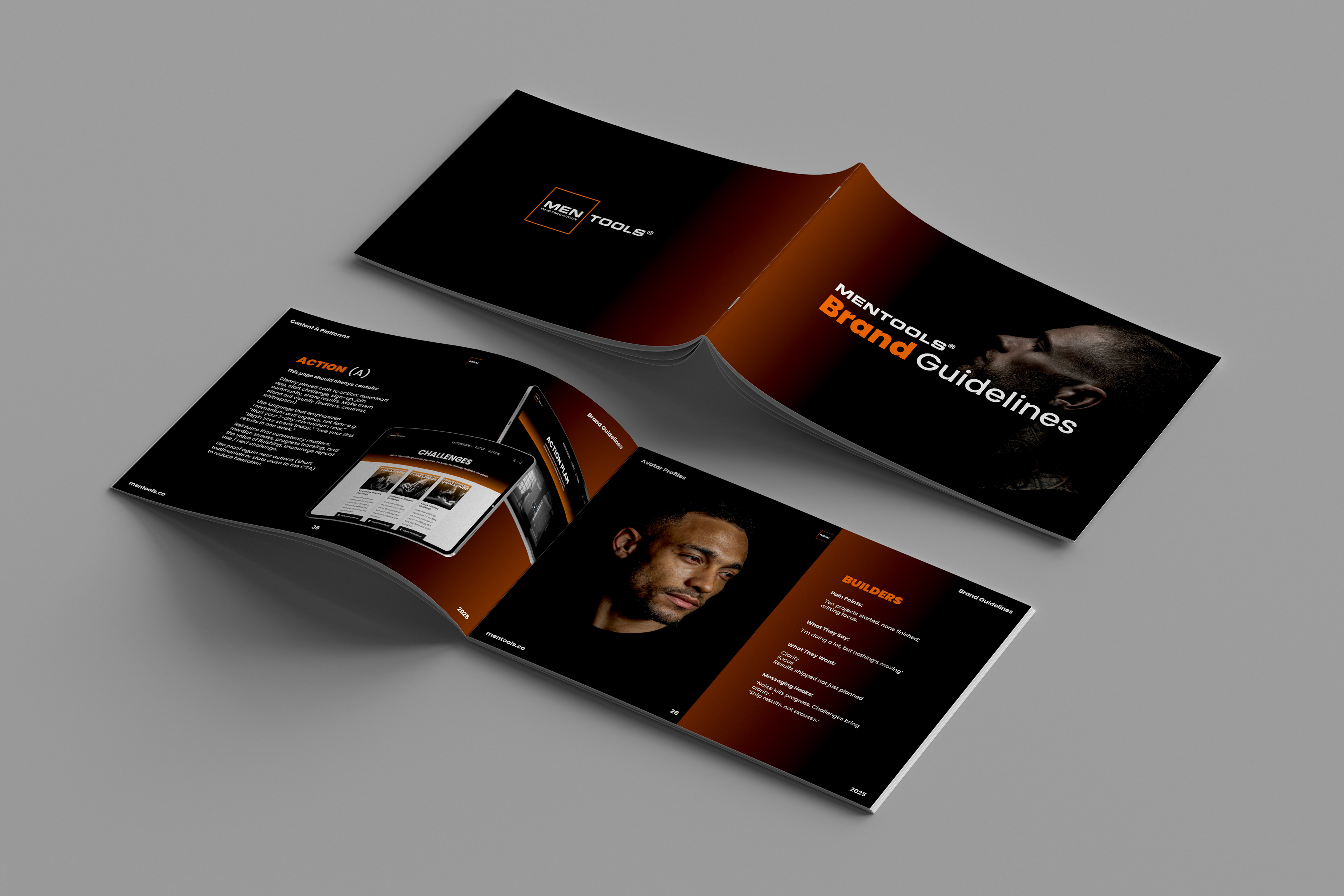 The brand guidelines were built from the ground up, covering every touchpoint a growing brand would encounter, colour system, typography hierarchy, logo usage and spacing rules, iconography, and tone of voice. The goal was to create a document thorough enough that any designer, developer or external partner could pick it up and produce work that felt unmistakably MenTools.